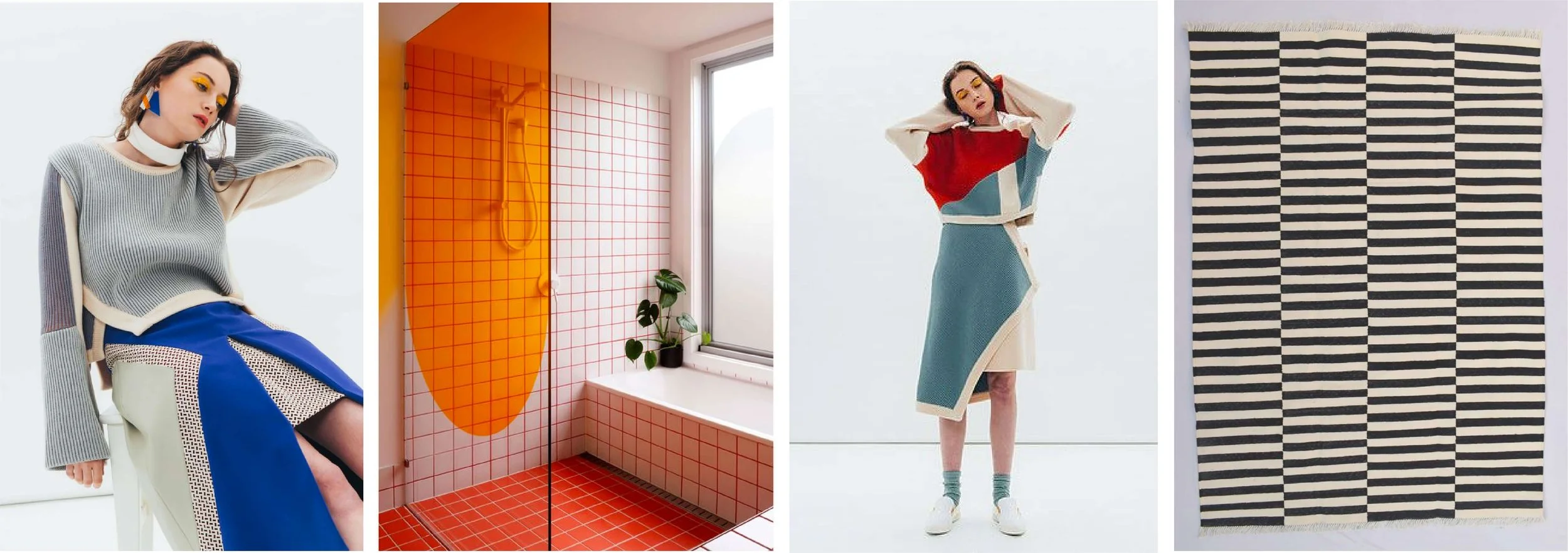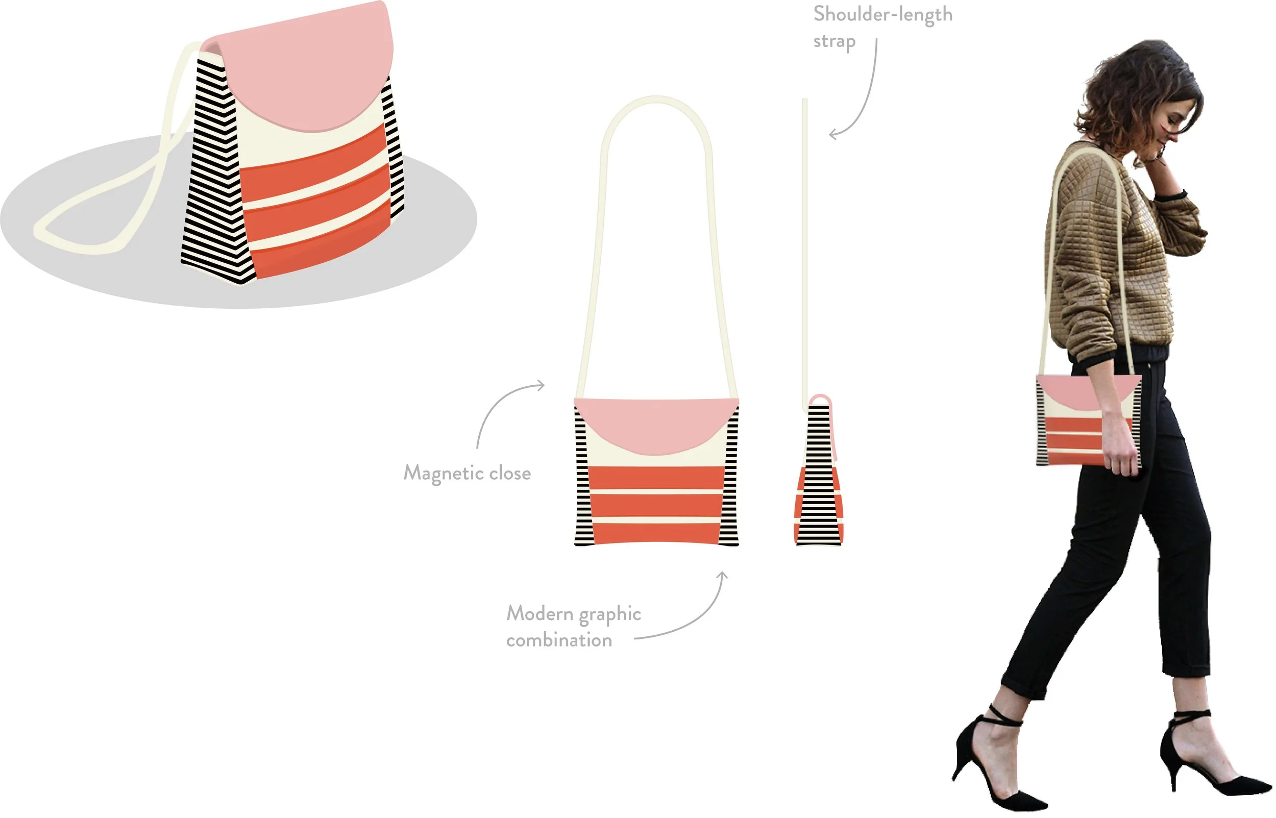 A sleek, modern shoulder bag with a combination of bold graphical elements and colors.