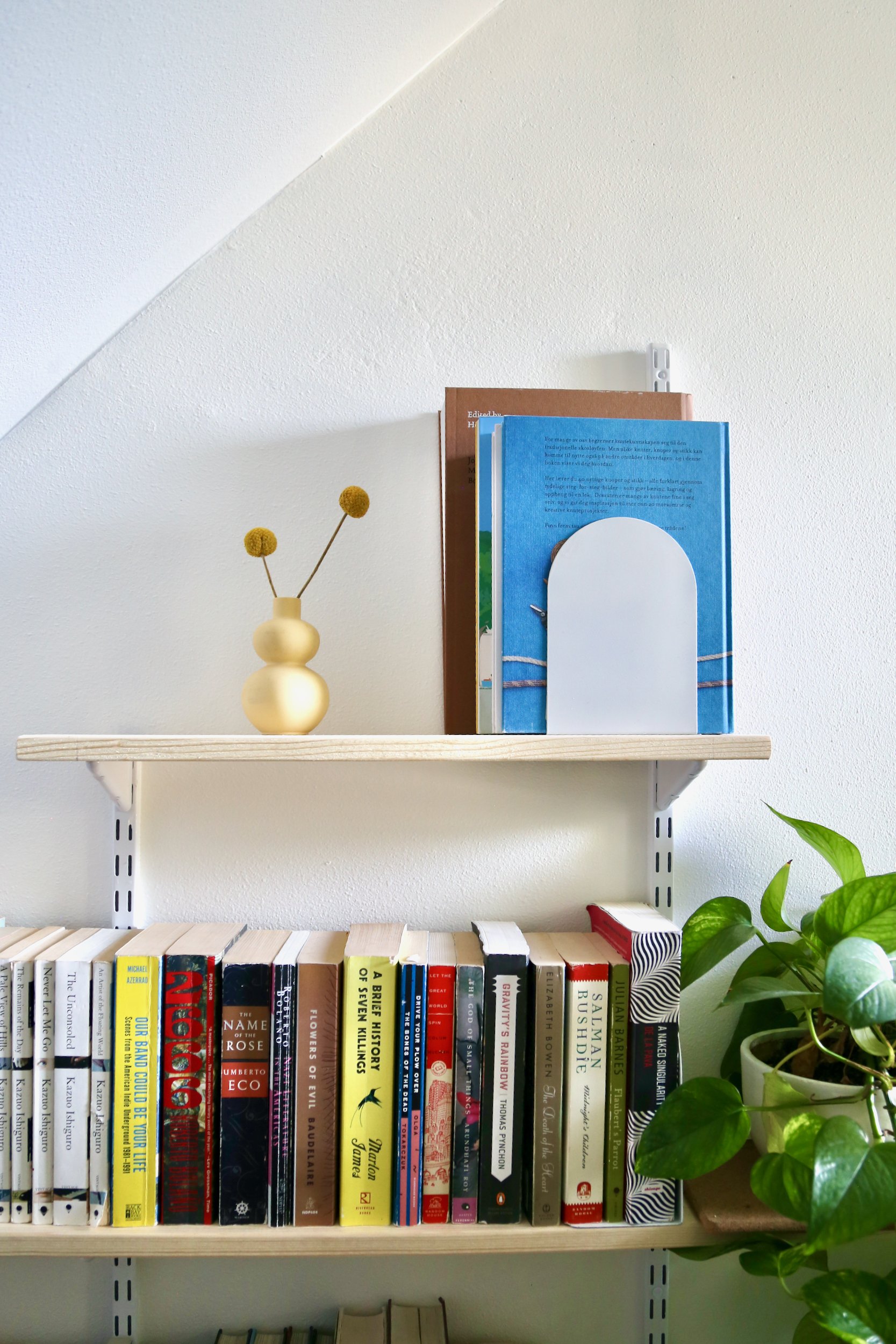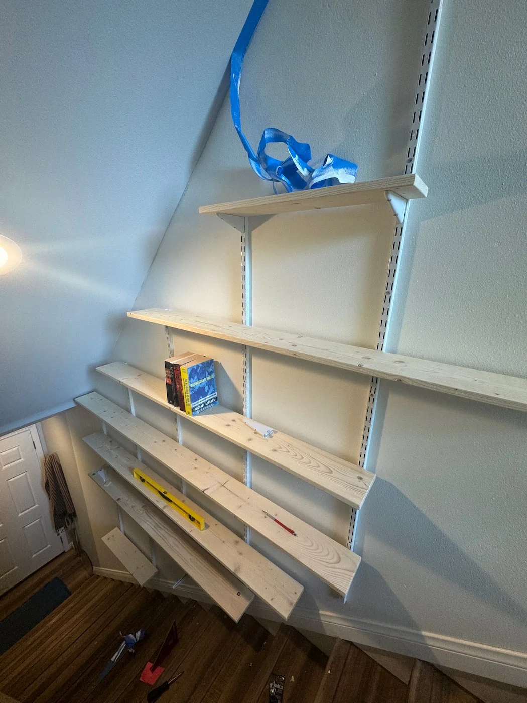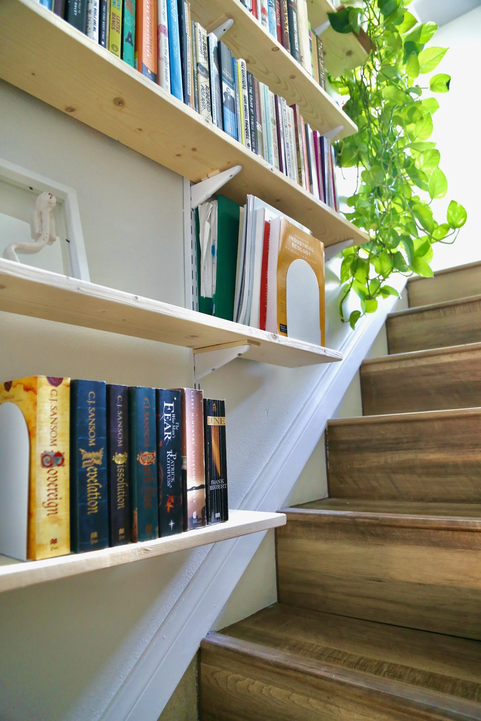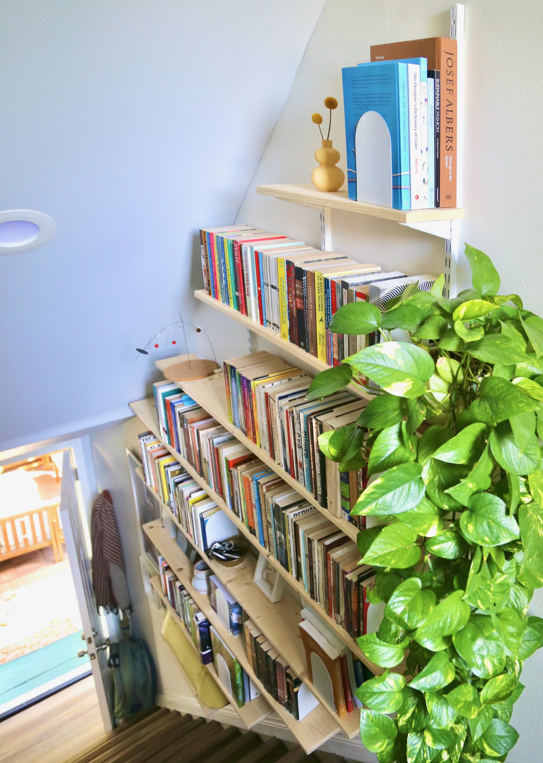 We used a track system to create the shelf structure. This allowed us to “step down” the staircase as needed, building the unit to the exact specs of the space. The modularity of track shelving offered the best opportunity to play with shelf length and spacing.