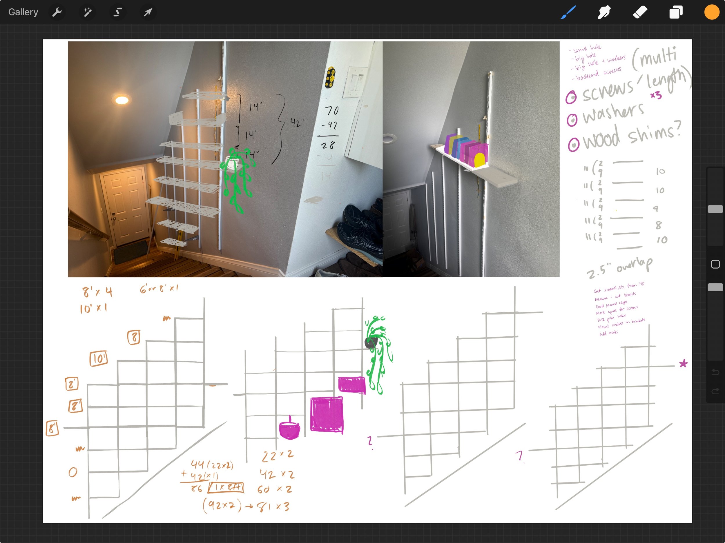 I used Procreate to sketch potential versions of the shelves, overlaying them onto images of the space.